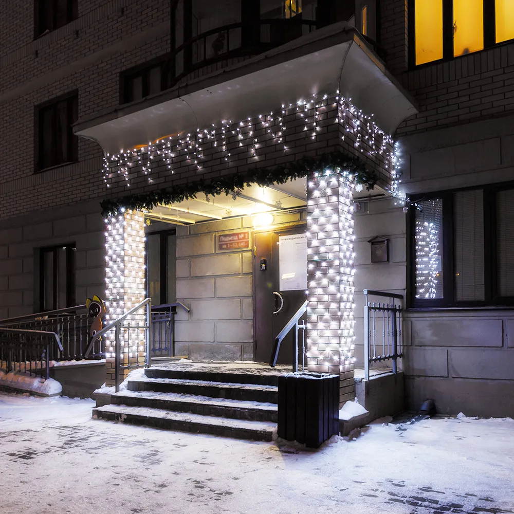 Светодиодная бахрома Classic. Размер 2400 мм (длина 2400 мм, по длине 24 нити высотой 200/600 мм). Количество светодиодов 88 шт размером 7 мм. Основной цвет свечения БЕЛЫЙ (6000 К), эффект мерцания редких точек (БЕЛЫЙ 6000К) с мягким световым рисунком (выпуклая молочно-белая линза), соотношение светодиодов: 22 белых постоянного свечения / 12 белых с мерцанием. Провод черный, ПВХ. Питание 230 В, Мощность 6 Вт, защита IP65, применение на улице под навесом. Аксессуары для подключения приобретаются отдельно.