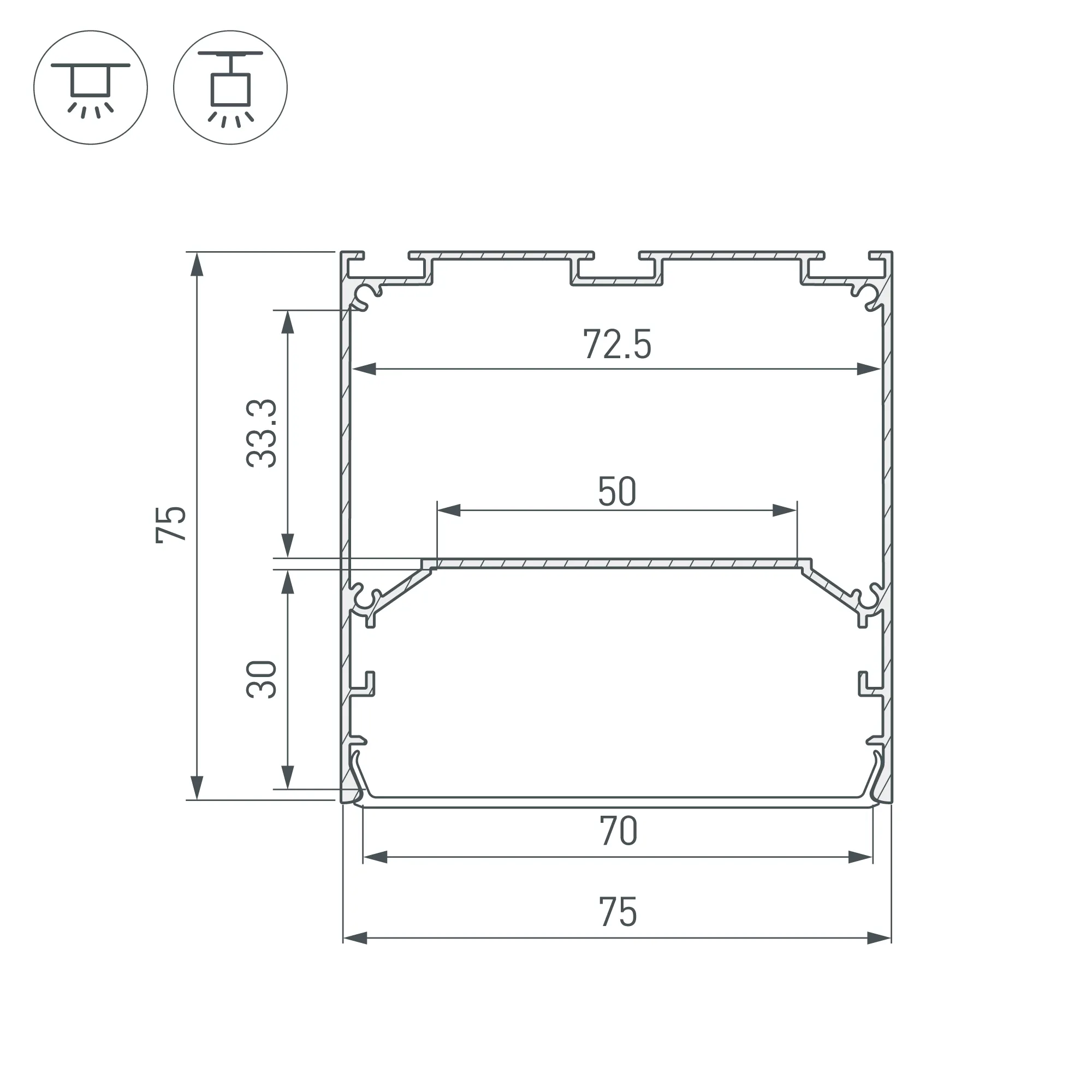 Алюминиевый профиль для светодиодных лент и линеек. Цвет - белый RAL9003 (порошковая окраска). Габаритные размеры (L×W×H): 2500x75x75 мм. Ширина площадки для ленты 50 мм. Отсек для БП 72,5х33,3 мм. Экраны, заглушки и другие аксессуары приобретаются отдельно. Цена за 1 метр.