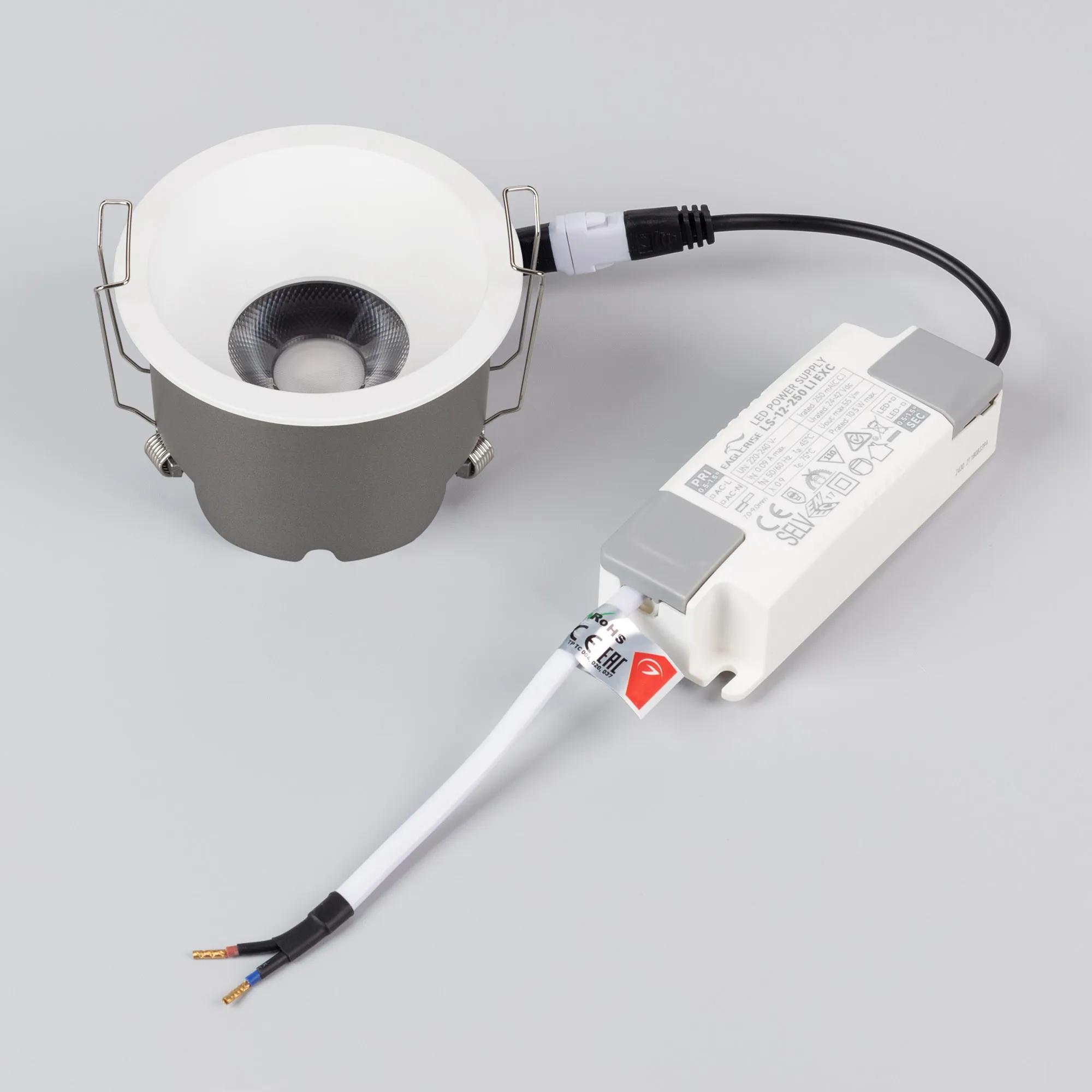 Встраиваемый светильник даунлайт. Мощность 10 Вт, св. поток 980 лм, 98 лм/Вт, тёплый 3000 K, CRI>90, угол 24°, напряжение питания 230 В. Белый круглый корпус из алюминия, степень защиты IP20. Размер: диаметр 82 мм, высота 53 мм. Монтаж встраиваемый, установочное отверстие: диаметр 75 мм. UGR<14. Драйвер 30-42 В, 250 мА, пульсация <2%.